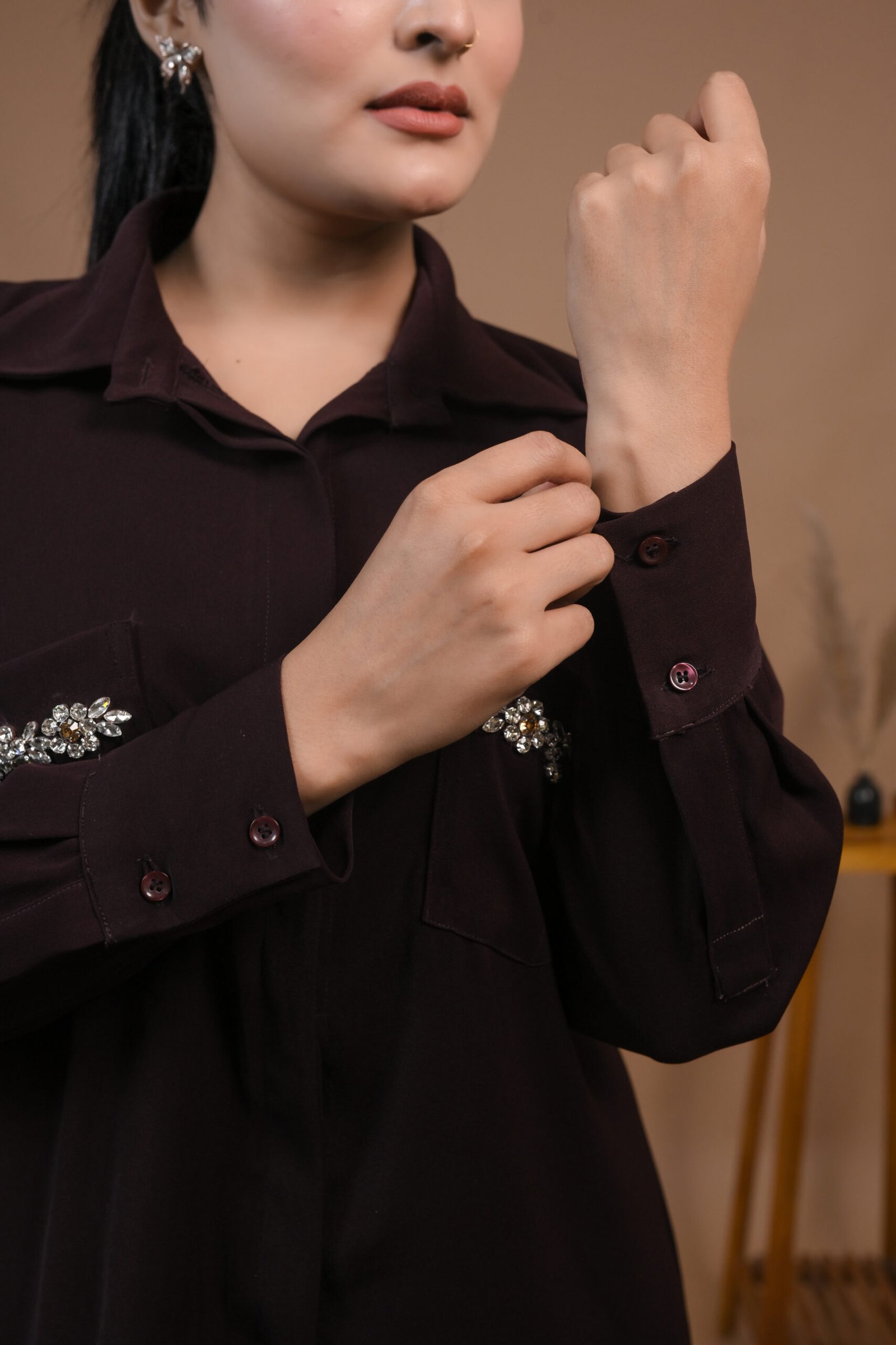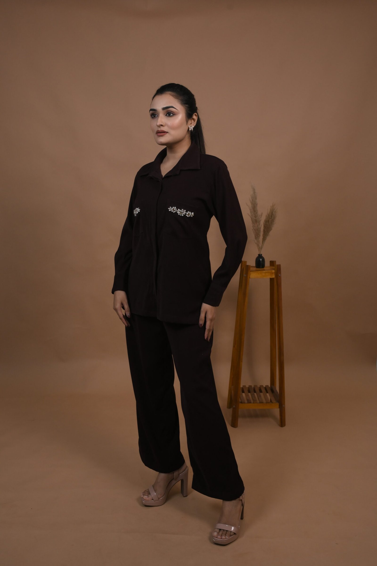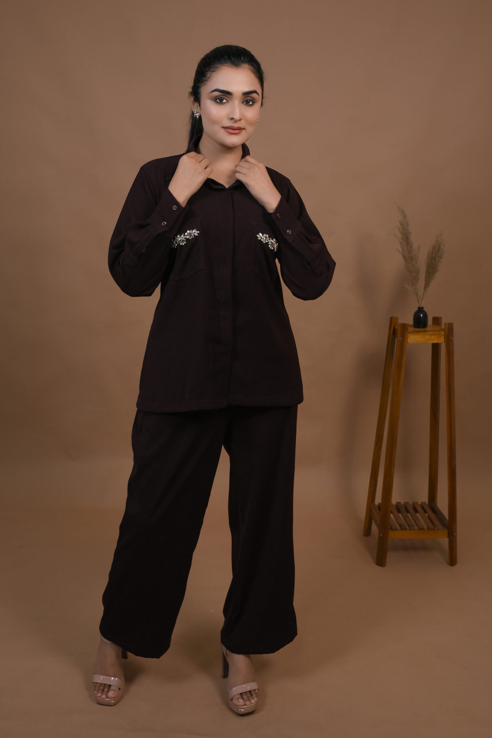 Brown Embellished Pockets Co-ord Set
